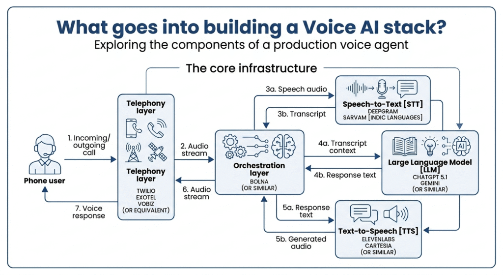 Let’s inspect what goes into building a voice AI stack from those who have done it from scratch while it was still emerging. A production voice agent is not a single API call alone. The basic structure itself will need to stitch together a telephony layer (Twilio, Exotel, Vobiz or equivalent), a speech-to-text [STT] model [Deepgram or Sarvam for Indic languages], a large language model [LLM, say ChatGPT 5.1, or Gemini], a text-to-speech [TTS] engine [ElevenLabs, Cartesia, or similar], and an orchestration layer [Bolna or similar] that coordinates all of them together to make it functional enough to trigger a call.